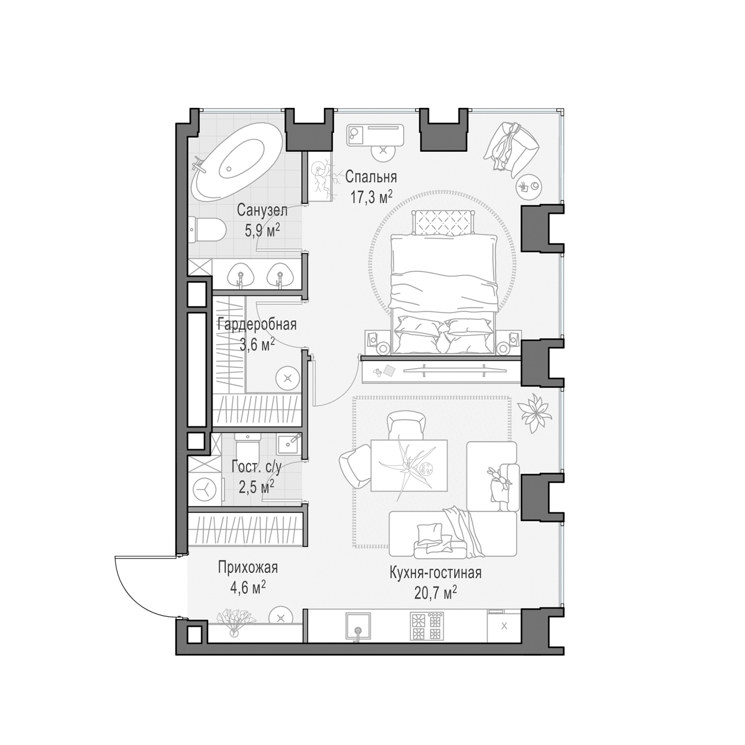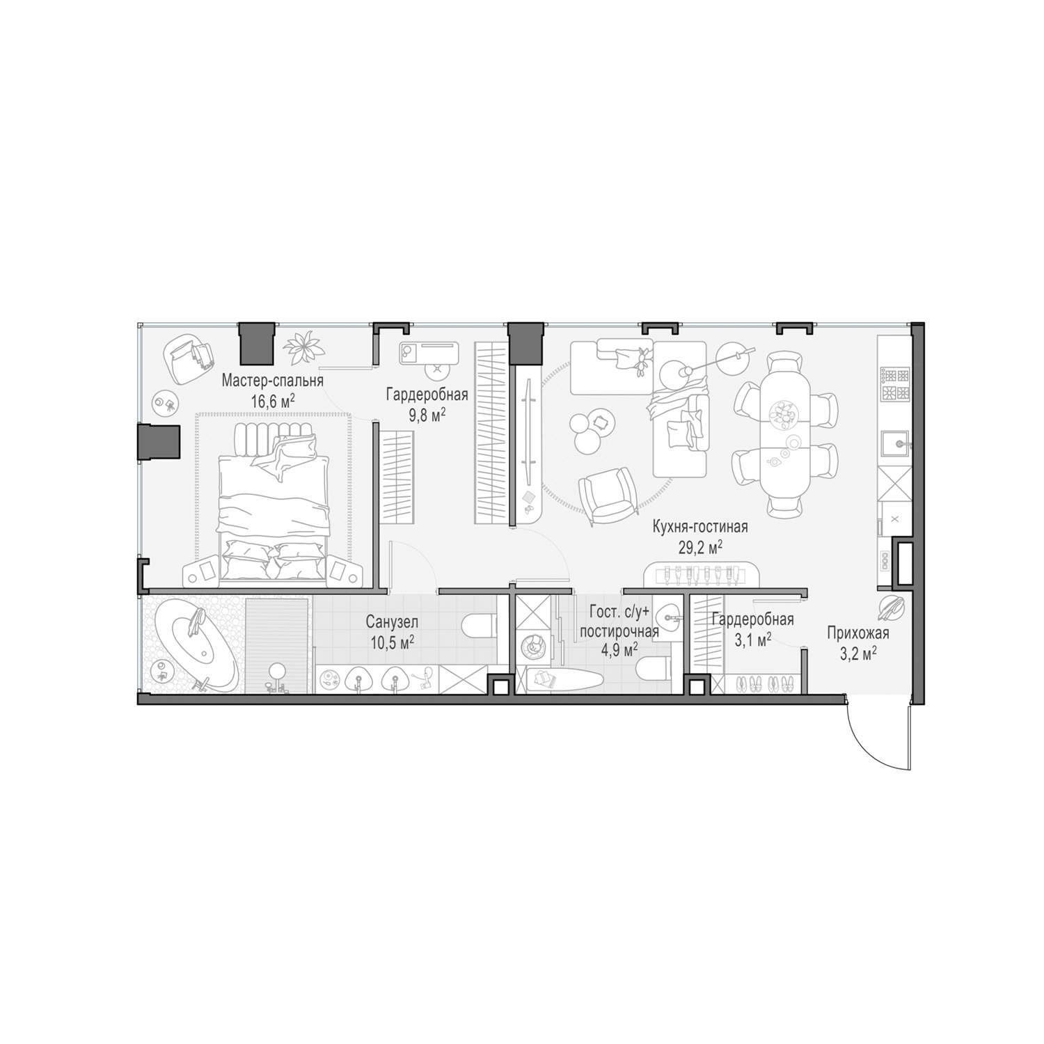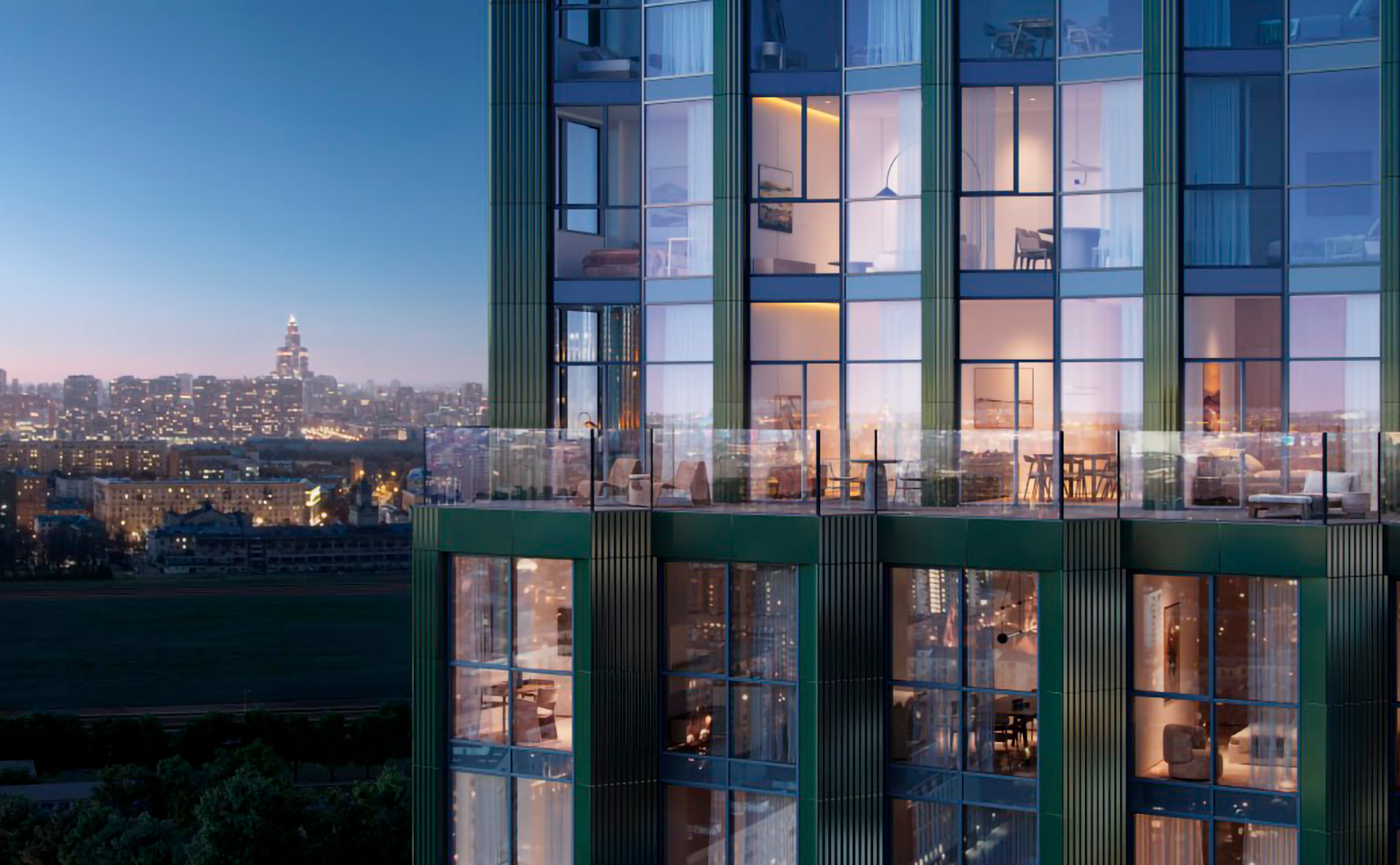 Уникальные небоскребы разной этажности. В квартирах предусмотрены мастер-спальни с гардеробной и отдельным санузлом, в том числе ванные со стеклянной стеной, есть приватные террасы, а в пентхаусах — дровяные камины, окна в ванных и витражное остекление во всю пятиметровую высоту.