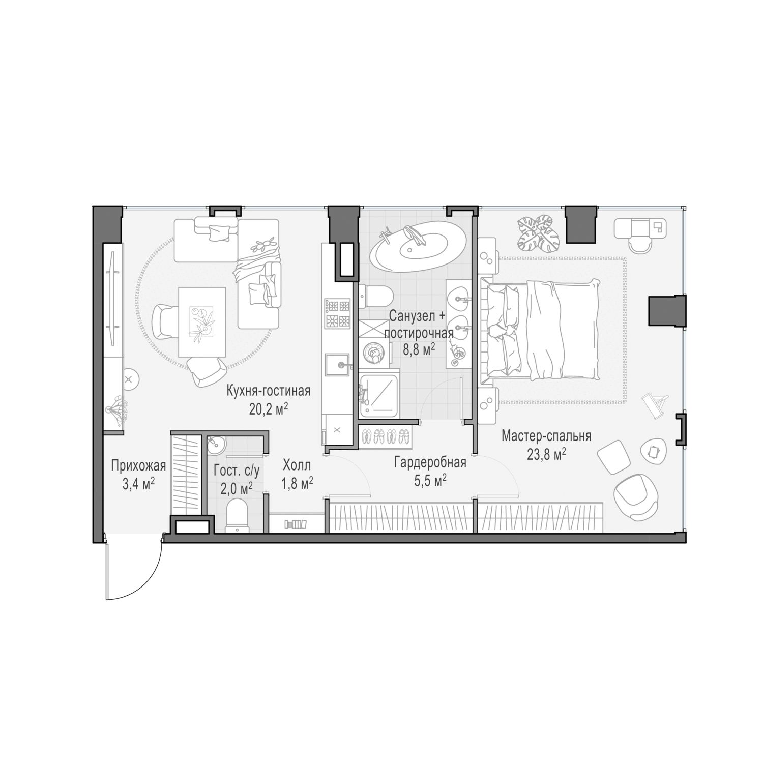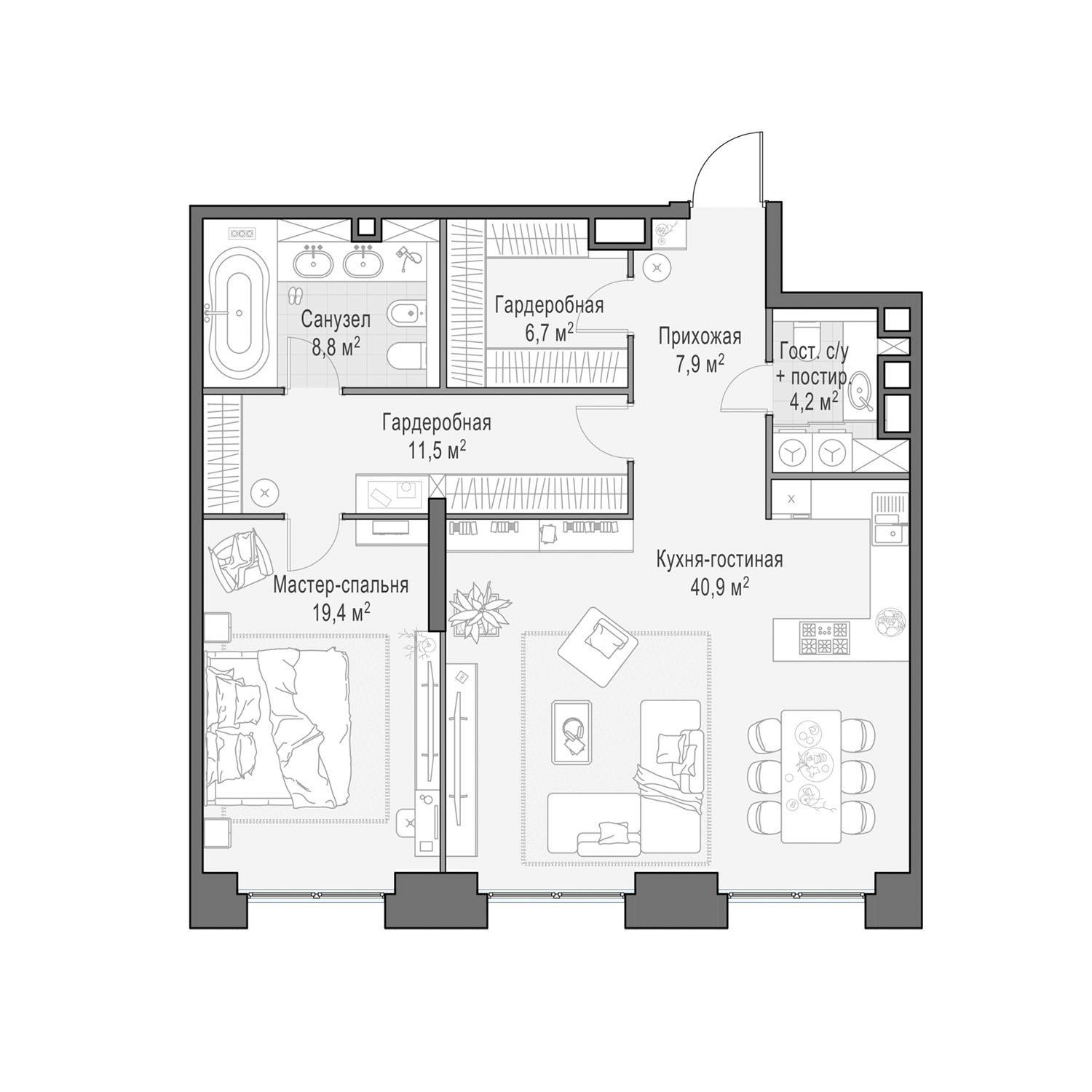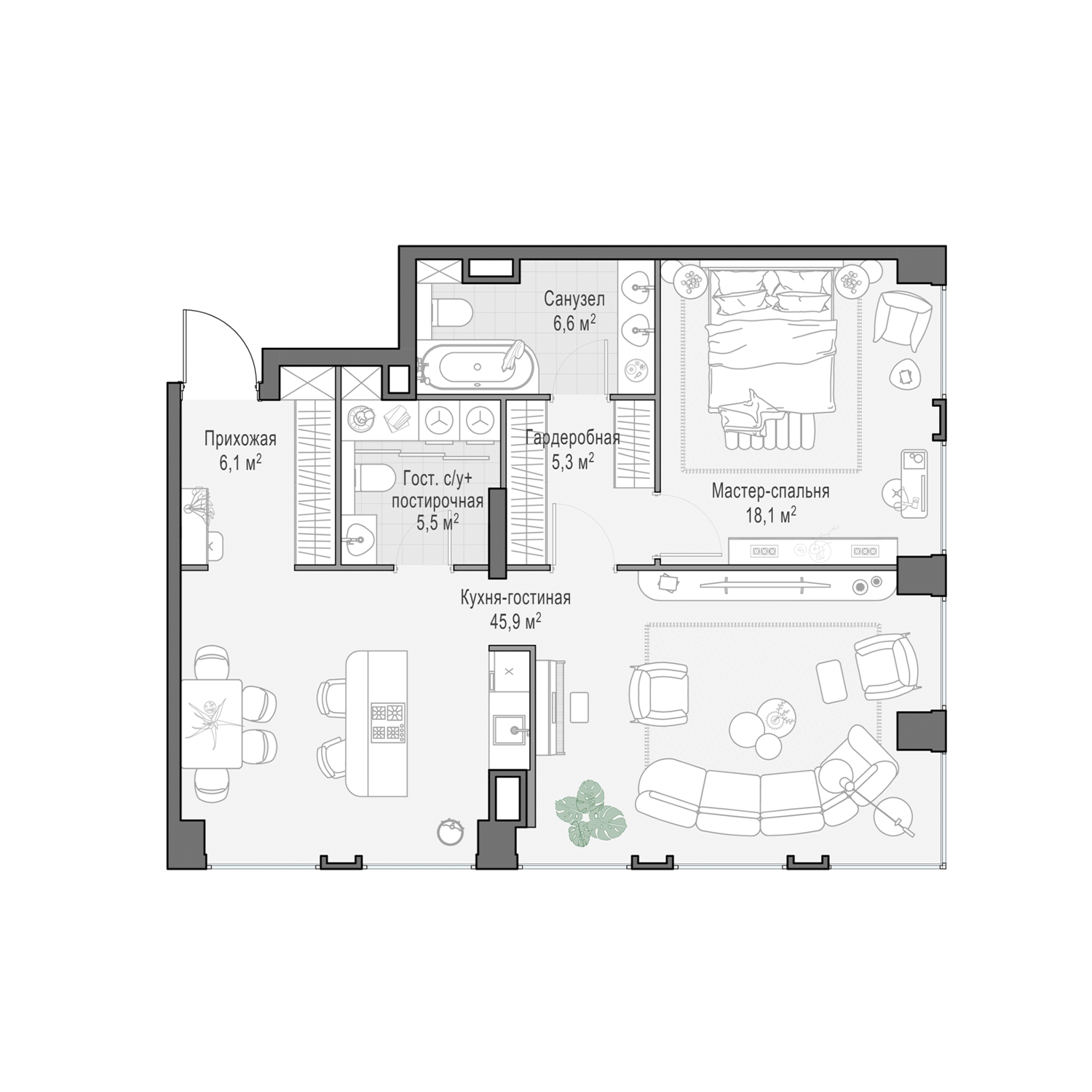 Уникальные небоскребы разной этажности. В квартирах предусмотрены мастер-спальни с гардеробной и отдельным санузлом, в том числе ванные со стеклянной стеной, есть приватные террасы, а в пентхаусах — дровяные камины, окна в ванных и витражное остекление во всю пятиметровую высоту.